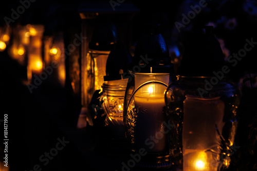 Nastrojowe ujęcie cmentarza po zmroku, gdzie jedynym źródłem światła są palące się znicze. Migoczące płomienie tworzą ciepłą, melancholijną atmosferę, podkreślając duchowy i refleksyjny wymiar miejsca
