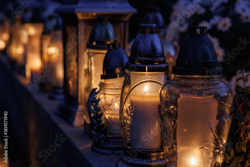 Nastrojowe ujęcie cmentarza po zmroku, gdzie jedynym źródłem światła są palące się znicze. Migoczące płomienie tworzą ciepłą, melancholijną atmosferę, podkreślając duchowy i refleksyjny wymiar miejsca