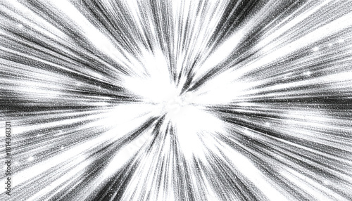 ザラザラした質感のモノクロ爆発効果と集中線 レトロなノイズが入ったスピード感のある白黒背景 グランジ風の衝撃的な星の光と粒子エフェクト