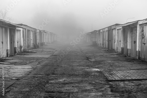 Zamglona aleja starych garaży w czerni i bieli. Monochromatyczna fotografia przedstawiająca perspektywę rzędu starych, betonowych garaży spowitych gęstą mgłą.