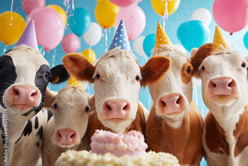 Cows wearing party hats celebrate a birthday in a bright party room. Colorful balloons and cake add festive mood.