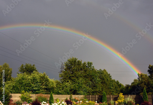 kolorowa tęcza na burzowym niebie nad drzewami i ogrodem, Colorful rainbow in a stormy sky over sunny garden with flowers and trees