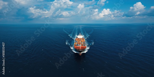 Aerial view of an expansive cargo ship navigating open waters, emphasizing maritime transportation, World Maritime Day