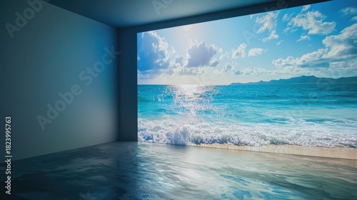Person is standing in a gallery space with a huge projection of the sea and a beautiful sunny beach on a wall in an art gallery