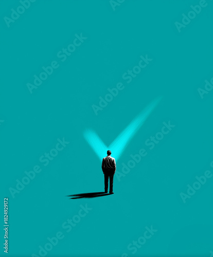 Sylwetka człowieka w garniturze stoi na turkusowym tle, oświetlona promieniami w kształcie dużego symbolu zaznaczenia ("ptaszka"). Symbol wyboru lub sukcesu.