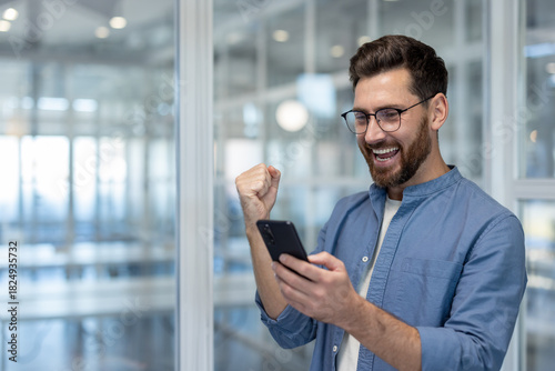 Young man in blue shirt standing in a modern office, expressing joy and excitement while looking at his smartphone, celebrating a significant achievement or good news