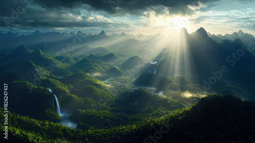 An aerial view of a vast, verdant mountain range with dramatic sunbeams piercing through the clouds and illuminating waterfalls and mist-filled valleys.