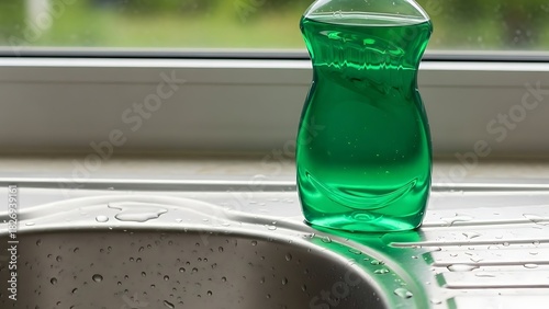 Green Liquid Dish Soap Bottle on Kitchen Sink Window Sill