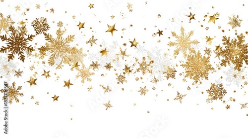 Gold snowflakes and stars on transparent background. New Year illustration PNG image.