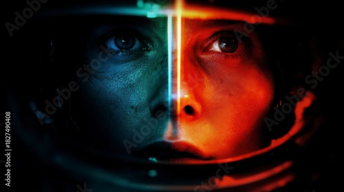 Echoes of the Cosmos: A contemplative astronaut's face, bisected by contrasting hues, reflects the duality of space exploration, conveying wonder and introspection.