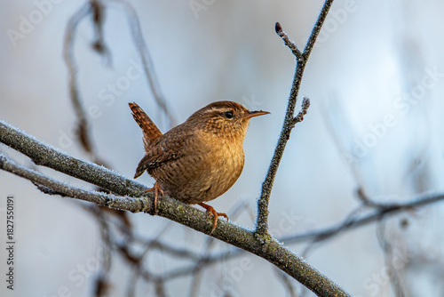 Strzyżyk siedzący na oszronionej gałęzi. Jesień i zima trudnym czasem dla ptaków niemigrujących