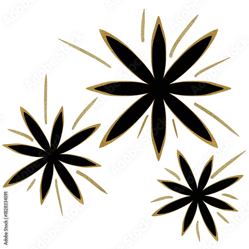 The black and gold floral and tree designs are intended for decorative illustration purposes.