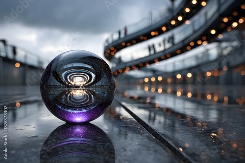 Glaskugel reflektiert futuristische Architektur und dramatische Lichtszene