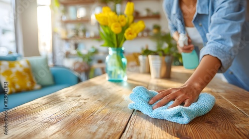 Woman is cleaning a wooden table with a blue cloth. The table is surrounded by potted plants and a vase of yellow flowers. Concept of warmth and comfort, as the woman takes care of her home