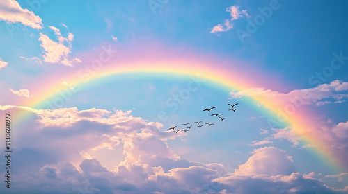 七色の虹が空いっぱいに広がり、白い雲が調和する開放感ある昼の風景イラスト素材。自然、虹、空、草原、明るい、癒し、ナチュラルな印象の画像に最適。