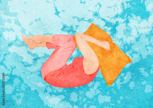 Ilustracja młoda kobieta skulona z poduszką na głowie na tle chmur i błękitnego nieba.