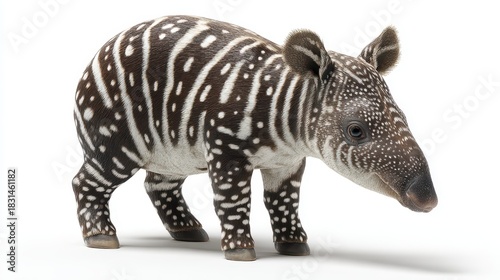 A close-up of a striped tapir standing gracefully on a white background.