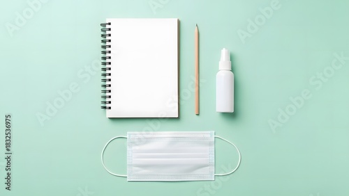 Minimalist workspace with notebook pencil sanitizer and mask on green background