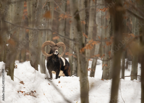 Dorosły tryk muflona stojący na śniegu w naturalnym, zimowym środowisku. Zwierzę ukazane w pełnej sylwetce, z wyraźnie widocznymi skręconymi rogami i charakterystycznym umaszczeniem. Fotografia przyro