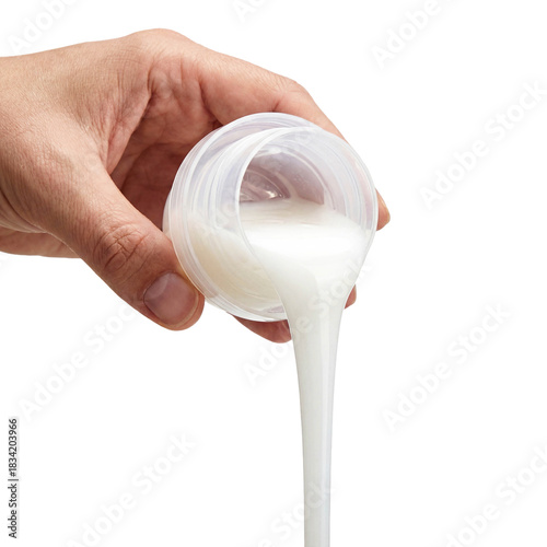 Hand pouring liquid detergent gel measuring cap isolated white background png transparent cutout laundry washing blue fluid viscosity cleaning product household chores soap bubble studio shot