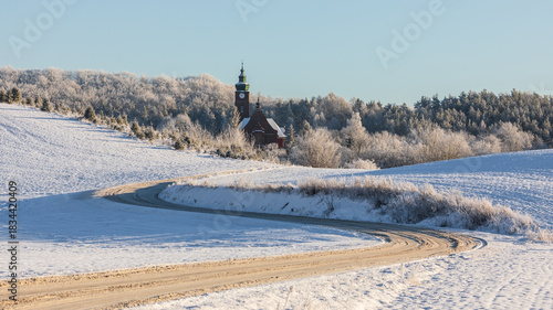 Winter Road to Wygoda Łaczynska, Poland. Church in the background.