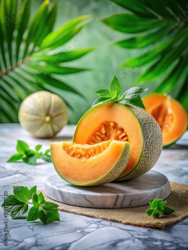 Vibrant sliced cantaloupe melon on a luxurious marble background with lush green leaves and subtle shadows