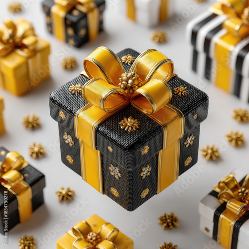 Black & Gold Gift Boxes with Snowflake Decor - Floating Arrangement Light Gray Background Holiday Material