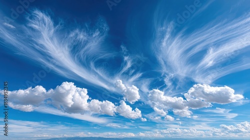 Beautiful blue sky with wispy cirrus clouds and fluffy cumulus clouds.