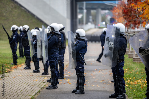 Policjant z tarczą na manifestacji na demonstrantów. Protest