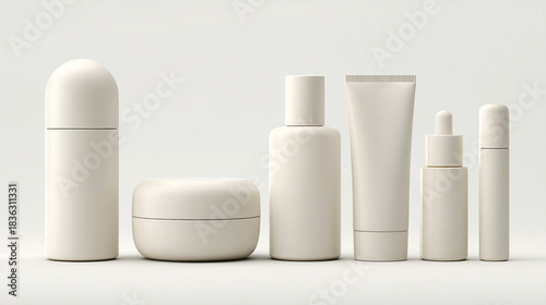 Envases cosméticos minimalistas en tono crema alineados sobre fondo neutro en composición limpia