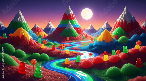 Whimsical candy mountain landscape with gummy bear inhabitants