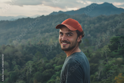 Uśmiechnięty mężczyzna w czerwonej czapce na tle gór i zielonego lasu.
