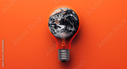 Planeta Ziemia w żarówce na pomarańczowym tle – koncepcja energii i ochrony środowiska