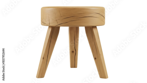 Isolated wooden stool with three legs, round seat with organic wood grain detailing