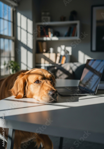 Cachorro deitado na mesa ao lado de notebook em ambiente doméstico iluminado pelo sol