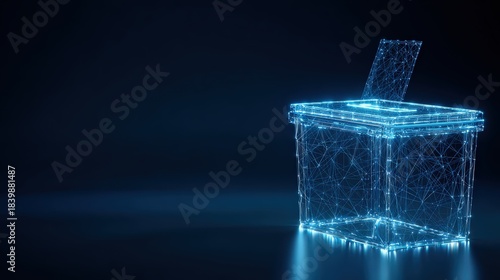 A futuristic depiction of a ballot box, illuminated with vibrant blue light and showcasing a modern concept of the electoral process. ..Created with Generative AI, not depicting real subjects.