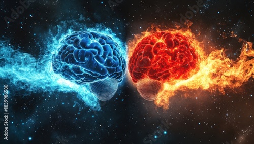 Conceptual depiction showcasing opposing brain hemispheres within cosmic energy fields