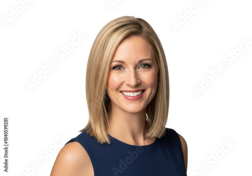 Professional headshot of a smiling blonde woman with medium length hair wearing a dark blue dress isolated on transparent background