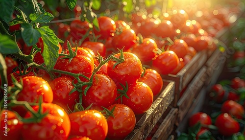 Vibrant ripe tomatoes glistening with water droplets under bright sunlight in wooden crates.