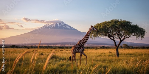 Wildlife scene with giraffes and acacia trees in a savannah setting, natural habitat for editorial headers