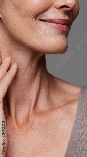 Mature woman smiling, subtly touching wrinkled neck and chin, representing natural aging skin, beauty, skincare, and the grace of growing older