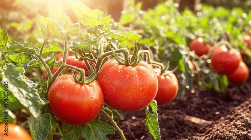 Fresh ripe organic tomatoes glistening in bright sunlight