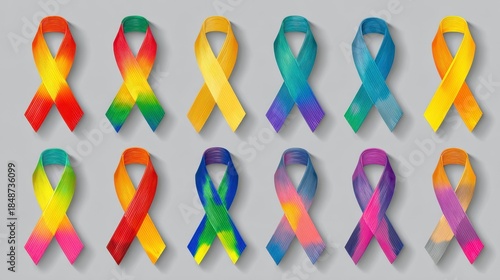 A collection of watercolor ribbons in various bright colors, set against a neutral gray background. The ribbons represent a range of causes