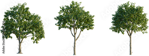 Catalpa speciosa tree front, elevation view, cutout, isolate 4K PNG, Three green trees with lush foliage on transparent background