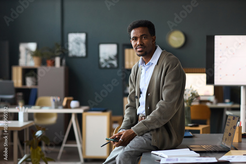 Portrait of Black man sitting on desk holding smartphone and pen, looking into camera in modern office environment with charts and documents visible on workspace