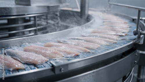 Medium shot of a spiral belt freezer evenly applying a thin ice glaze on delicate fish fillets highlighting precise glazing technology for optimal freshness preservation.