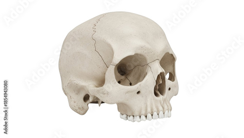 Human skull with visible sutures and cracks on a black background bone skeleton