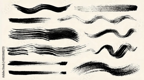 Set of black brush strokes on white background. Grunge artistic elements for design, texture overlays, abstract compositions