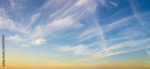 Wispy cirrus clouds streak across a vast blue sky, softly lit by warm golden hour sunlight near the horizon, creating a serene, expansive, tranquil atmosphere