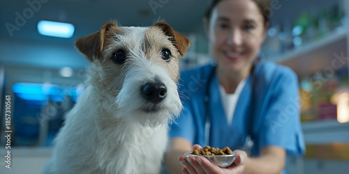 Dog with brown and white fur is being fed by a veterinarian in a clinic, showcasing care and compassion in a professional animal healthcare environment